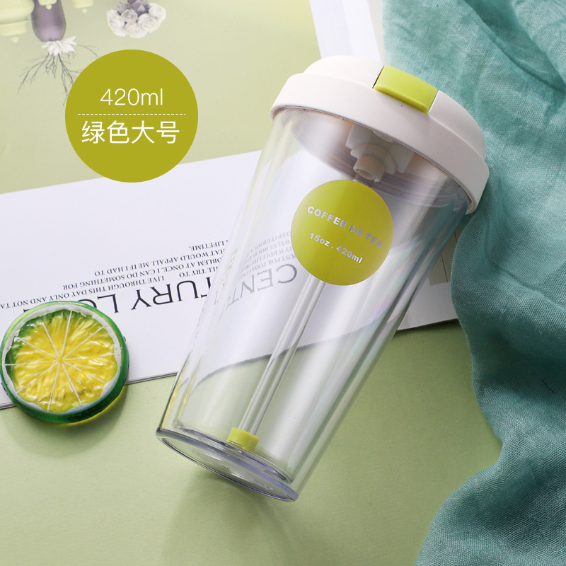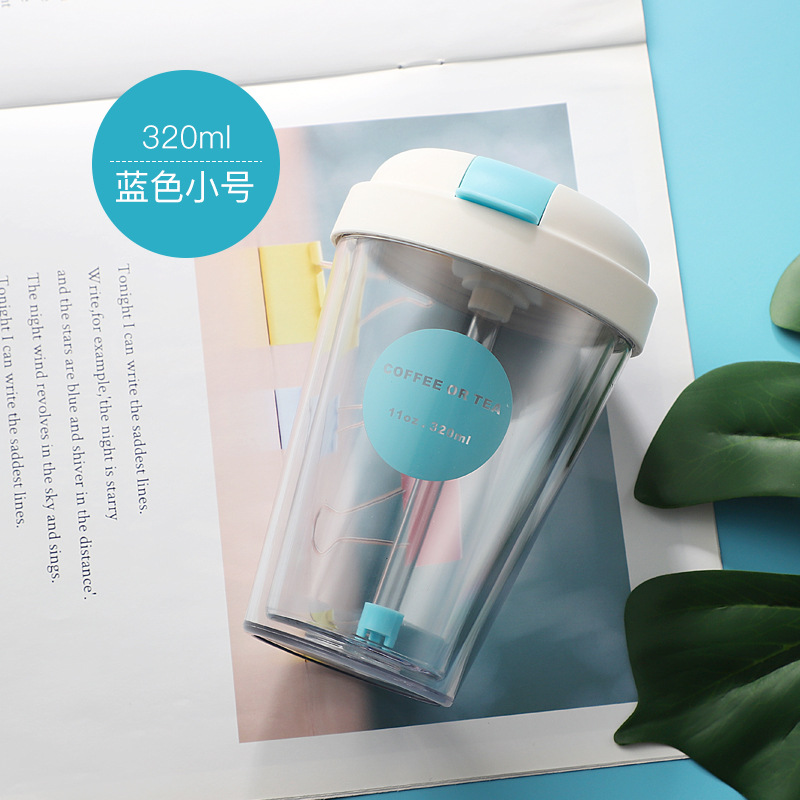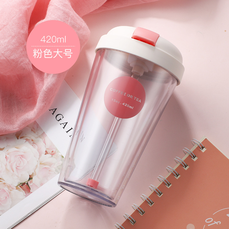 雙層塑料杯翻蓋吸管水杯學(xué)生兒童便攜水杯奶茶果汁簡約杯子